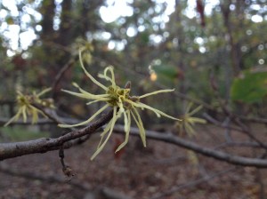 Witch-hazel that is. I was walking through the woods in late October, watching the leaves rain down in a cascade of yellow and red, when I noticed what my mom would call a “punky” flower, not unlike a long-haired punk rocker. She normally would be referring to the garden and roadside herbaceous flower Beebalm but I think she would be open to including the Witch-hazel flower as a “punky.” Most shrubs and trees flower in the spring and into the summer, but not the Witch-hazel. This deciduous shrub or small tree, Hamamelis virginiana, waits until autumn to put on its own little show in the understory of the woods. The irregular naked brown buds are scalpel-shaped and you can certainly notice them along the thin twigs that appear to be zig-zagging to their branches. The oval green leaves