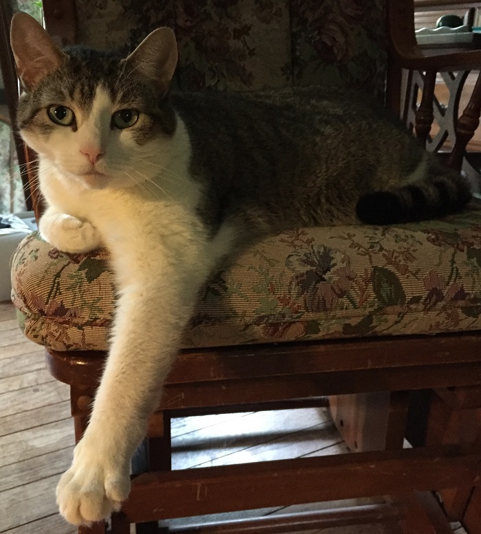 Recently a long-haired white cat with a black-and-white bustle tail showed up in our neighborhood. We know not whence this bedraggled beauty arrived but s/he is here wandering and bustling about. I have spoken with several neighbors and no one seems to know if this cat has lost his or her human or if s/he is a drop off. My friend and neighbor Lisa named the stray Bustle because the cat’s tail does look quite poofy.
