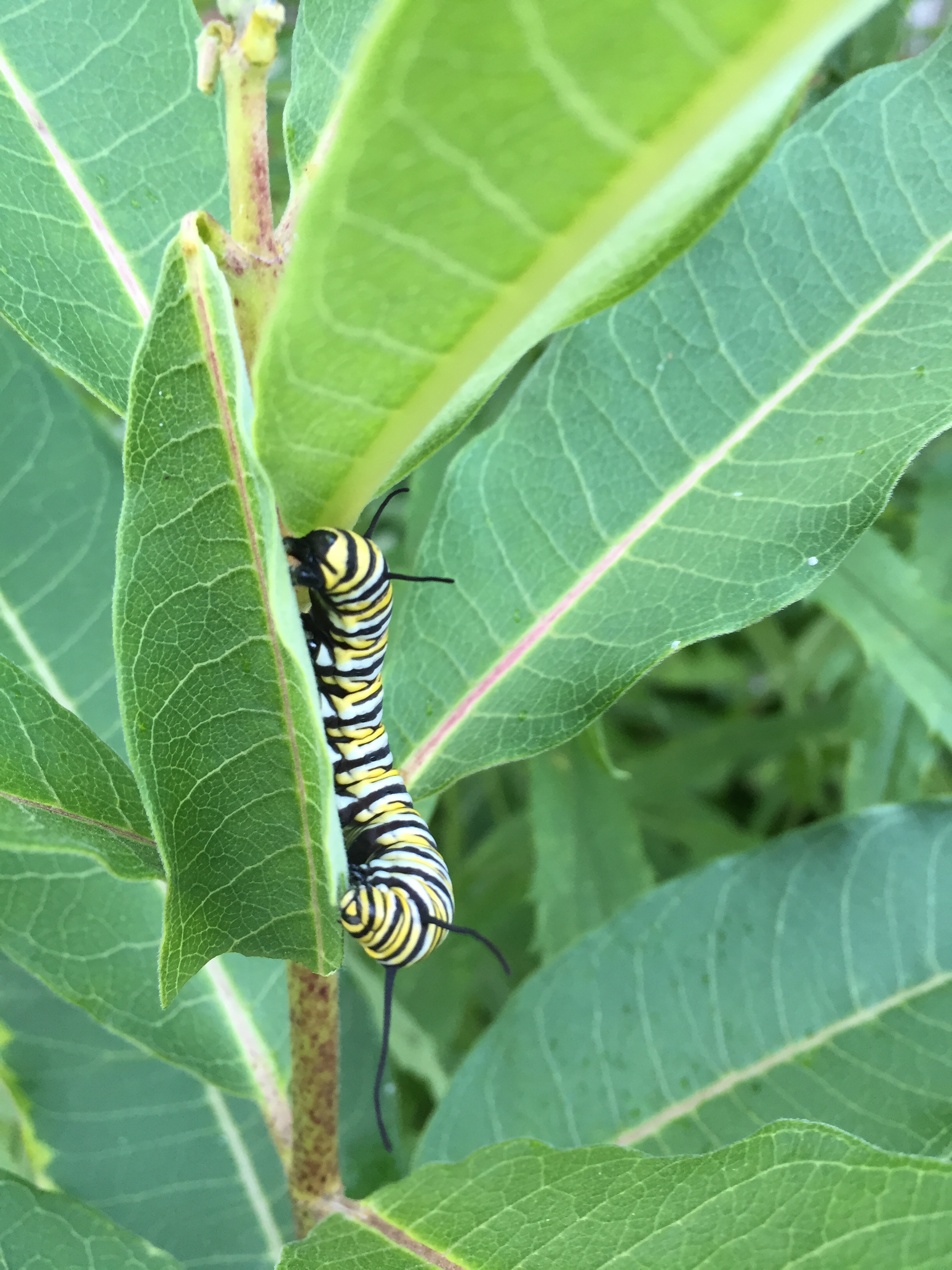 I have been watching monarch caterpillars in the garden, munching their way along the milkweed leaves. Good thing the milkweed gathered enough energy from the sun through their leaves to have already formed their pods, which have grown rapidly to full size – now they just sit and wait for autumn to dry out their husks, splitting them down the middle, and for a good, strong breeze to send the parachute seeds aloft. The seeds will land a-ways from the parent plant – and if they are lucky, they will grow next spring. But the milkweed actually has a more efficient tactic as well – though the plant will die back in the winter, the roots stay alive beneath the ground and send up more shoots in the spring. And this is why you can find a line of them growing. Or if you pull up one to transplant it, you’ll suddenly find you are also moving several more with branching roots connecting them. You have to be very gentle in transplanting milkweed because the thick stems break very easily. You will notice when any part of this plant is broken it will exude a white sticky sap. This latex-like sap is toxic, containing cardiac glycosides, and this is exactly what the caterpillars are eating as they consume the leaves. The toxin doesn’t affect them but it makes the adult butterfly taste absolutely awful to a bird. (You will have to ask a songbird because this is only hearsay to me, not having tried to eat a monarch butterfly.) It’s true that it is does not necessarily save that individual butterfly but that bird will remember that striking orange and black patterning as a warning not to partake.