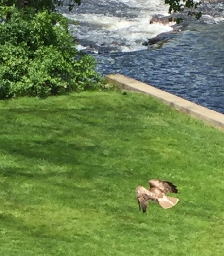 Bald eagles mate for life and after recommitting to nest and nerve, the pair copulate and either build a nest or add to the prior year’s nest. Nests are designed with sticks, large and small, with the pair helping each other position them. Nests tend to be 5-6’ in diameter and 2-4’ tall in the top-most part of a large live or dead tree, close to the trunk, and below the crown. The female lays 1-3 eggs in March and the pair take turns sitting on the eggs to keep them warm and dry. Eaglets hatch in mid-April and the busy parents again take turns hunting for food for their rapacious young. Food consists mainly of fish as these are fishing birds who live along rivers and other large bodies of water. But eagles will also hunt and kill geese, ducks, and small mammals. Outdoor pets are not exempt. Bald (meaning white, not featherless) Eagles also scavengers and will eat carrion. Yes, that’s right, our noble aviary symbol of the United States of America are opportunists and are just as likely to stick their head in the bloody cavity of a deer left by other predators as they are to rake the water and pull up a wriggling and very surprised trout. And that “pweeee” sound you hear in the movies when they are showing a Bald Eagle soaring, is actually the call of the Red-tailed Hawk. The Bald Eagle has more of a high-pitched chortling call. Listen for their “laughter” at Ashfield Lake as there is at least one who visits our shores.