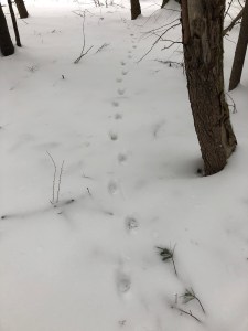One can see the clear X in the four-digit print of the red fox and the five-digit prints of the raccoon with larger back paws than front. I spent my Saturday wandering the land, exploring what the wild ones left behind in the snow. Is evidence of urine marking territory or a female in estrus? It is mating season, after all, and everyone wants to know who is hooking up with whom and who has been where. A raised rock in the field became the bulletin board with multiple species stopping to check who had been there and where they were headed. It’s the social media hot spot of the wild lands!