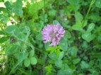 Red clover, Trifolium pratense, in the Fabaceae family, has round, dense flower heads that really look more purple than red. Notice a pale chevron on the upper surface of ovate leaflets. It is best to pick the flower head apart and scatter the petals into the salad instead of munching down on the whole head.