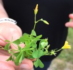Yellow wood sorrel, Oxalis straicta, in the Oxalidaceae family, has dainty heart-shaped leaves. The flowers have 5 yellow rounded petals. All aerial parts are edible raw. The sour taste is from their high oxalic acid content which is naturally occurring in several vegetables including spinach and rhubarb. Though oxalic acid can interfere with calcium absorption if you eat large quantities of raw plants containing it, sprinkling some leaves, buds and flowers should not be an issue.