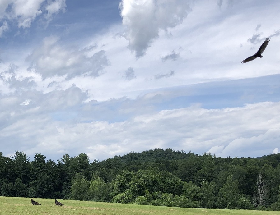 As I sit out in the garden stooped over weeding, I see a shadow circling and I look up and there is a turkey vulture. A yell up to the bird, “I’m not dead yet.” Turkey vultures, Cathartes aurahave, of the New World vulture or condor family, Cathartidae, have an amazing sense of smell and keen eyesight. Perhaps I was smelling overripe from my labors or looking like I was about to expire from the heat. But I was in no danger of getting preyed upon, as vultures mainly eat carrion, i.e. dead animals. Given that vultures eat dead animals and not wanting to get their plumage all bloody, both our turkey vulture and our black vulture, Coragyps atratus, have bald heads. Turkey vultures sport a red bald head and black vultures possess a black bald head. Bald head coloration is the easiest way to tell these two vultures apart. There is little sexual dimorphism as both males and females have similar coloration and size.
