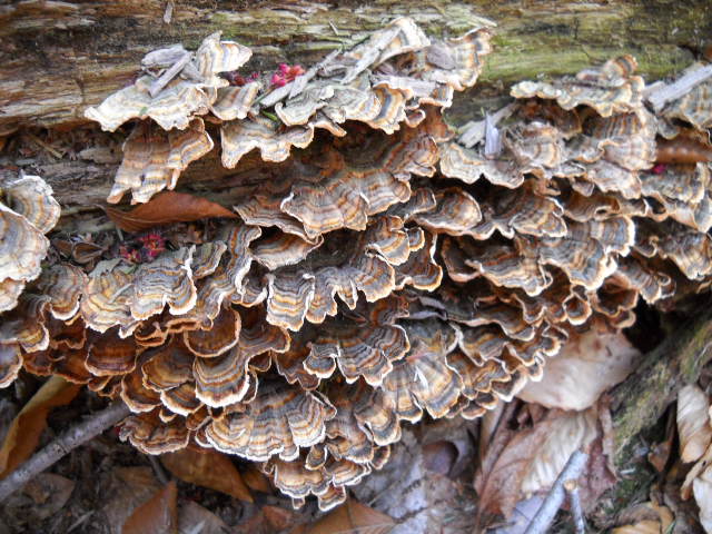 Turkey tail mushroom, Trametes versicolor, in Polyporaceae, is a shelf fungus forming on dead logs and snags in a fan-shape. As their name suggests, these fan-shaped fungi look like turkeys’ tails displaying. Color bands include browns, beiges, grays and plum tones. Edges will be the lightest color. To the touch this fungus feels leathery. Looking underneath, the surface will be white to beige with very tiny pores. A magnifying lens may be required to confirm pores. Turkey tails have no stems but attach directly to the dead wood. When conducting a spore print, use a dark colored paper because the spores are white.