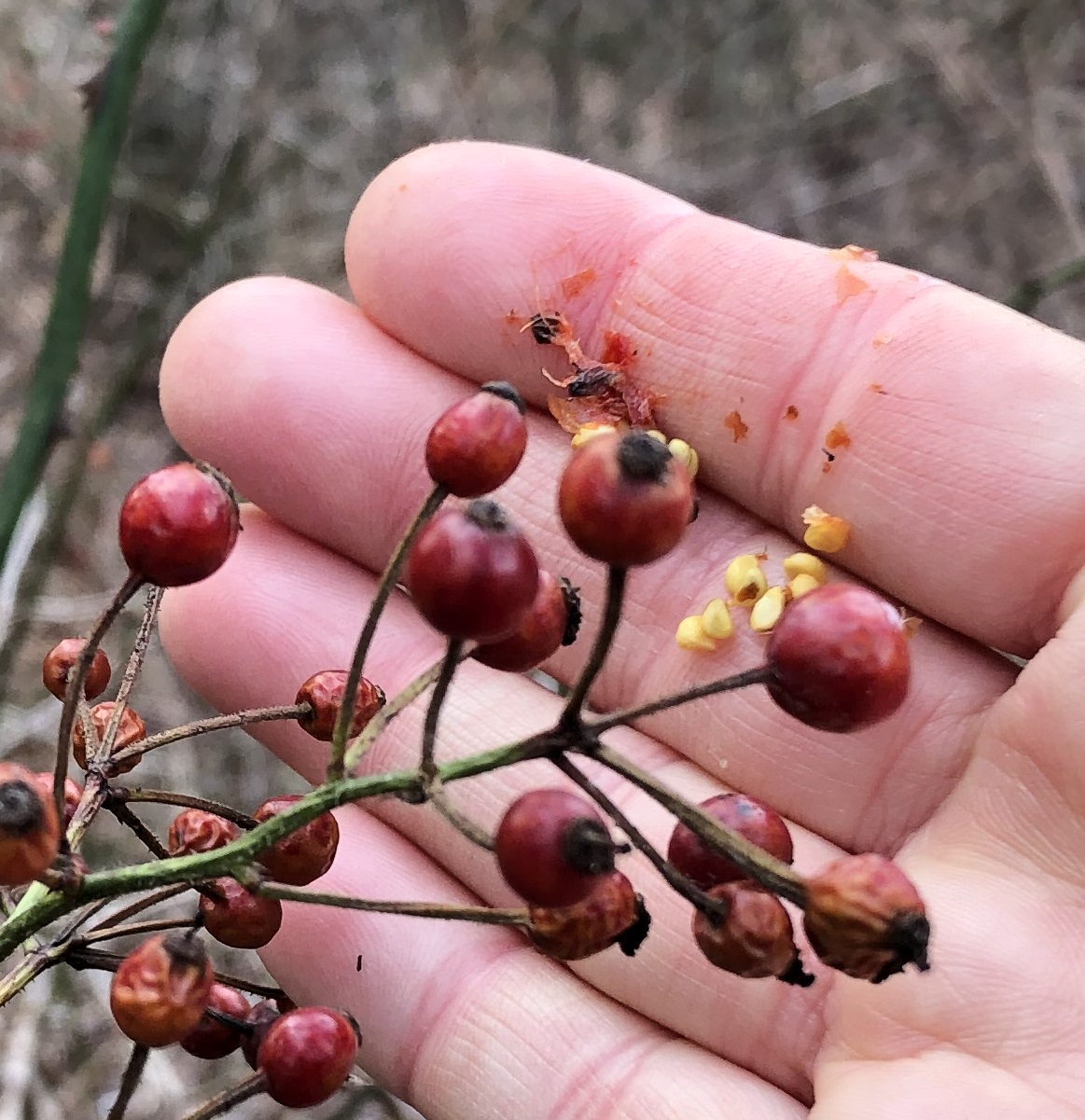 The invasive multiflora rose has persistent red hips that you can nibble on all winter long. Rosehips are the original chewable vitamin C. Pop them in your mouth and they will taste just like those sweet-tart chewable vitamin C tablets. If you decide not to swallow the seeds, do not spit them on the ground because then you would only be helping to spread this aggressive invasive. Instead swallow or spit seeds into a tissue or baggie and throw those seeds away into the trash. There will be 7 or more yellow seeds per tiny hip. This shrub has a rambling appearance and can stand up to 15 feet tall. Canes have stout, curved thorns. New growth is green. In the summer notice small white fragrant flowers – which are also edible. Be sure not to confuse the rosehips with another invasive berry – bittersweet, which can grow alongside each other. Oriental bittersweet is a non-thorny woody vine with orange to red berries. Look for the yellow papery hull peeling back from these berries – which are not edible.