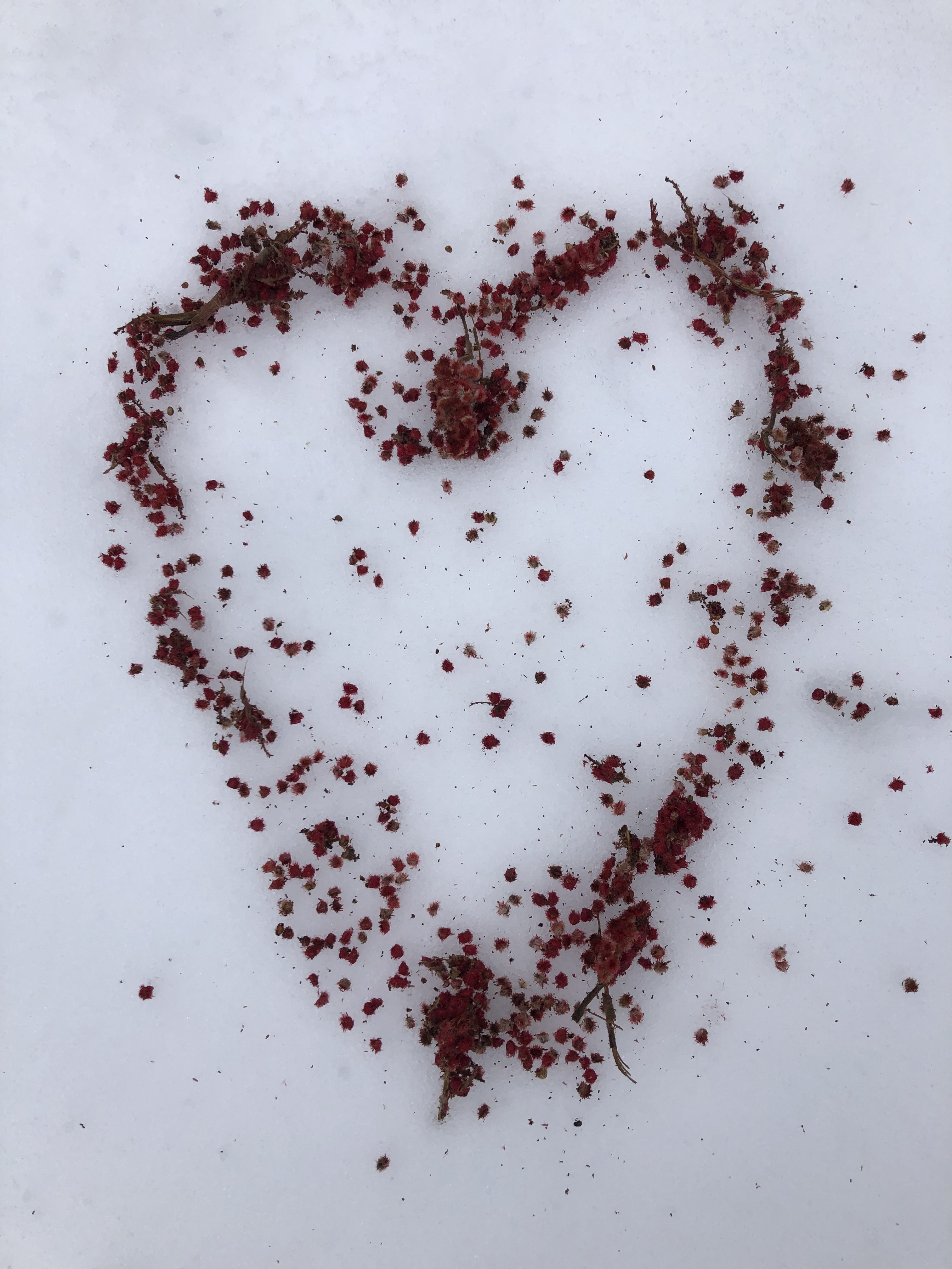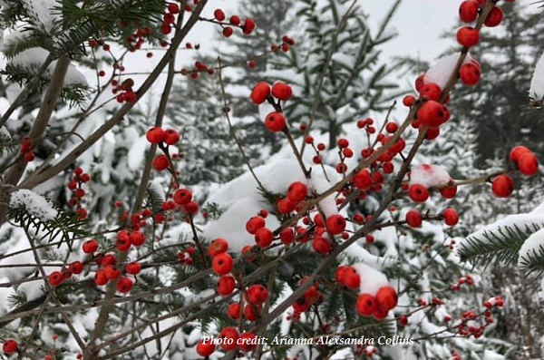 Even though the deciduous trees have shed their leaves and the herbaceous plants have died back to their roots and/or sent out their hopes and dreams for future generations in the form of seeds, the conifers are evergreening. Growing among our needle and cone-bearing trees, such as the spruces, we may find red berries clinging on vine, cane, and shrub. There are several red berries that can persist into and through the winter: multiflora rose, bittersweet, staghorn sumac, Japanese barberry, and American holly. And a few of these berries are even edible – rosehips, staghorn sumac, and barberry – bringing our taste buds cheer as we suck on the sweet-tart flavors of winter.