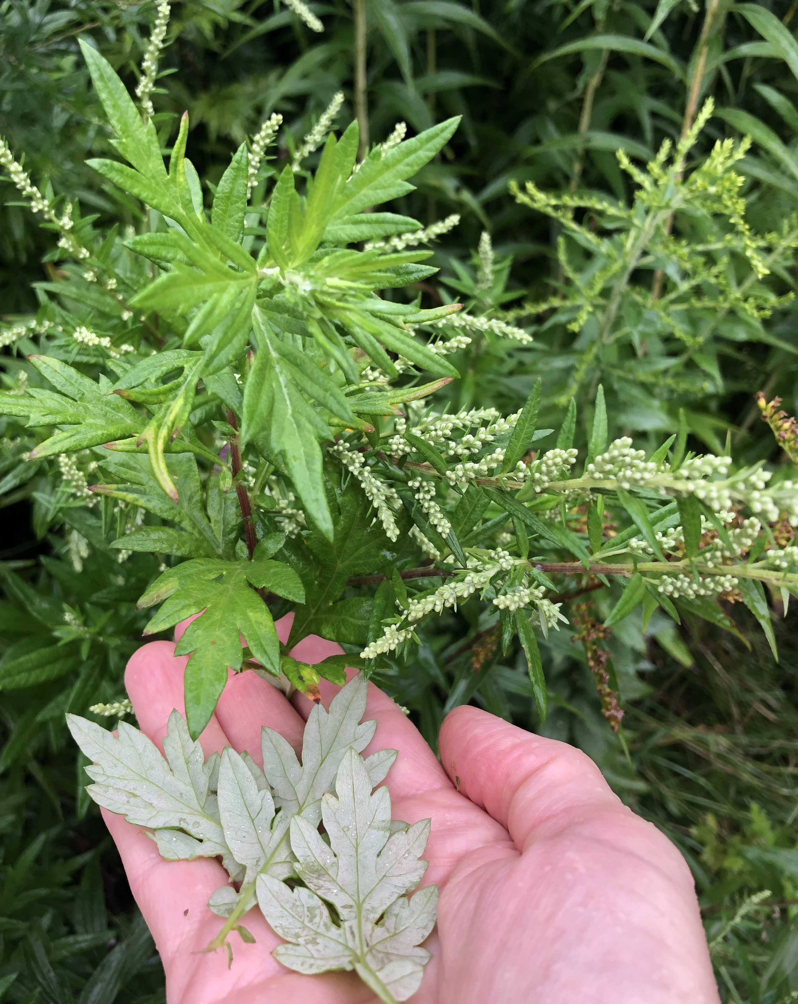 Mugwort, Artemisia vulgaris, in Asteraceae, has decided to make my yard their home. Individual plants grow both in and outside of my garden. They are so plentiful I am seeking to learn more about what gifts they offer. You can make smudge bundles from them. In the burning of bundles, they can act as an insect repellent along with a cleansing scent. Mugwort tea serves as a nervine, diuretic, digestive aid, and emmenagogue, which means it helps a woman bring on her period. But mugwort is not just medicinal, one can also use the leaves to flavor food. Before hops became popular in flavoring beer, mugwort was used. Plants grow up to 3-6’ tall. Leaves are green on top and silvery underneath, deeply divided, and possessing smaller lobes at the base of each leaf. Leaves at the base of the stiff red-brown stalk are more widely-lobed. When you pet the leaves then smell your hand, you will pick up their aromatic scent, which is spicy and slightly reminiscent of mint. The first time I munched on a leaf I let the taste linger in my mouth and then decided to chase the flavor down with evening primrose flowers which are, though not sweet, not bitter either.