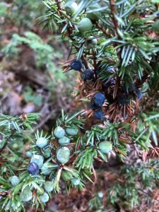I love the smell of juniper berries… but dislike the taste of gin. Go figure. But juniper berries can be more than just the main ingredient in gin. The common juniper, Juniperus communis, in Cupressaceae (cypress family) is a native New England evergreen coniferous shrub with sharp, white-striped, green needle-like leaves in whorled groups of three around the stem and green berries turning blue-purple when ripe. These “berries” are not actually berries. These fleshy tightly-scaled globes are the female seed cones. The male oval-shaped cones appear more beaded than cone-like, with yellow “beads” of pollen amongst green scales. The male and female cones grow on separate shrubs and are wind pollinated and bird-droppings dispersed. Juniper “berries” are edible and if you can wait the 2 years before they are ripe, you will be rewarded with more flavorful produce. That is if you can access the berries faster than the birds. From eastern bluebirds, cedar waxwings, and American robins to turkey and grouse, junipers are a go-to winter food staple. Common junipers prefer sunny fields so look for semi-abandoned fields and along the edges of fields. They can also do well with other conifers as long as they are not shaded out, such as within Christmas tree farms.