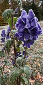 Monkshood, Aconitum napellus, is a member of the buttercup family (Ranunculaceae); a family of which there are few edibles and of those few tend to be eaten only cooked and as a last resort. This herbaceous perennial is also known as aconite, wolf’s bane, leopard’s bane, mousebane, women’s bane, and queen of poisons. And curiously, as devil’s helmet which one would think would be an opposite to a monk’s hood. And though aconite heralds from western and central Europe, it has been naturalized in North America, enjoying life as a garden ornamental. Its eye-catching spires of deep purple hood-like flowers are arresting in late fall as one of the only flowers left standing as the frost bites and destroys most other flowers. The dark green leaves which turn golden brown in autumn are palmate, thick veined, and deeply lobed with each lobe tri-lobed and toothed. As the flowers fade they appear veined and translucent, with the globular fruit showing through.