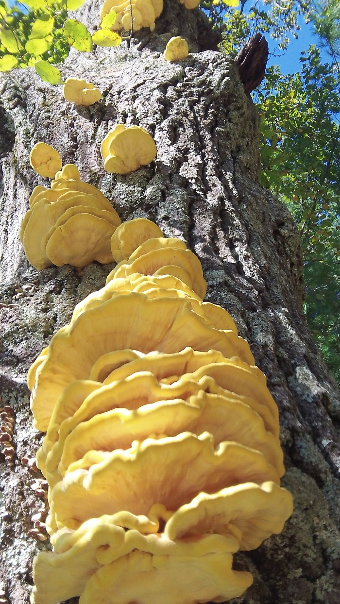Both polypore fungi are saprophytes, which means that they derive their nutrients by “eating” dead and decaying matter. They are important decomposers in the forest ecosystem. They can also be mildly parasitic on live trees. But don’t worry – they don’t kill their host. You can find them growing year after year on the same trees. I mainly find both Chicken- and Hen-of-the-woods growing on dead, dying, or very old live Red Oaks.
