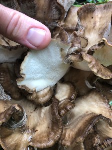 Hen-of-the-Woods aka Maitake (which means “dancing mushroom” in Japanese) Grifola frondose grows 1-3” fan-shaped caps forming rosettes at the base of living or dead oaks. Hen may also pop up at the base of other deciduous trees such as beech and yellow birch. Rosettes, looking somewhat like a sitting bird by the same name, can grow rather significant – over 2’ in diameter. The top part of the cap may be beige, brown and/or grey. The underside will be white or cream with pores. The stipe and branching system may remind you of cauliflower. The spore print will be white. Hen tend to be available for harvesting later August through October. When the flesh is firm it’s good for collecting. As the mushroom ages, caps will lose their firmness and crumble more easily. Hens can be sautéed fresh or dried or frozen for winter use. When drying, separate and either put in a dehydrator at 110-110°or on racks above a warm wood stove, and when caps are thoroughly dried, place loosely in a glass jar, close the lid, and store for later use in making soups. stir-fries, and tea. When dried you can also pulverize the caps into a powder to flavor meats, stews, dips, and tea. Hen is a healthy source of vitamin D2 and also helps to regulate one’s immune system, lower cholesterol and blood glucose, and is an anticarcinogen against breast cancer, bladder cancer, and renal/kidney cancer. There’s quite a bit of research on Maitake so feel free to look up all the health benefits for proper preparation.