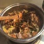 Chicken-of-the-Woods Laetiporus sulphureus and L. cincinnatus is a very noticeable fall fungi growing up and along the base of living or dead oaks or some other deciduous trees in dense clusters. There is also L. huroniensis which prefers to grow on conifers. All 3 varieties of chicken have pores producing a white spore print. L. cincinnatus’ capis salmon-colored and the underside is peachy-white. L. sulphureus has fruiting bodies that are bright orange in the center lightening to bright yellow at the edges. The underside is bright to light yellow. Chicken is a thick fan-shaped mushroom, up to 1” thick, with each cap growing anywhere from 2-20” in diameter. The stem or stipe is short and broadly attached to the cap. Ki has a pleasant earthy scent. When slicing Chicken, you may think you are slicing cooked chicken meat, as this mushroom is “meaty”.