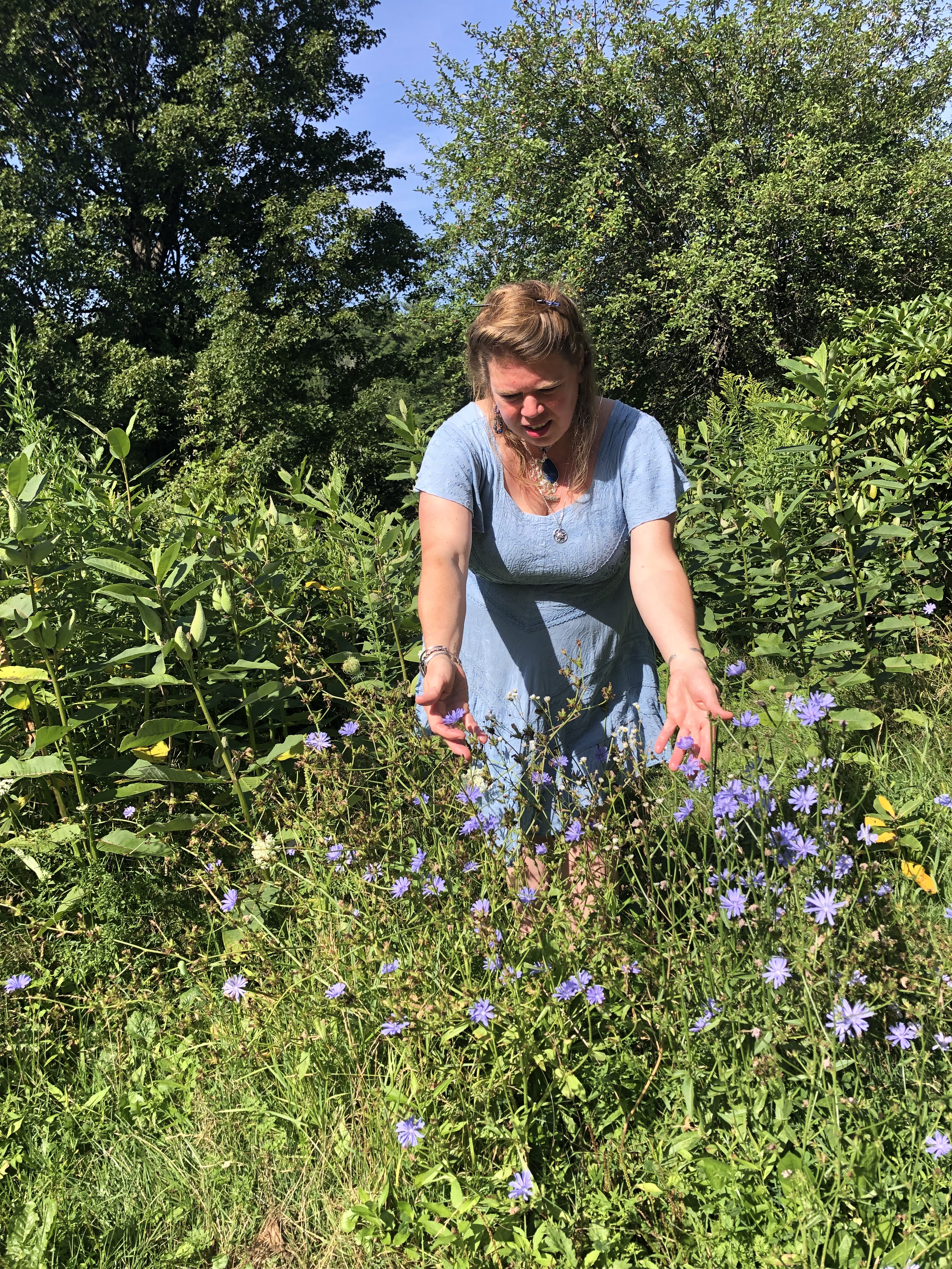 I had a “wait, you can eat that?” moment when I was looking up Chicory’s Latin name. I knew that the root is edible because for years I had been seeing the root in the food co-ops’ herbal bulk section. And then I learned that the flowers are edible and have been eating them for a few years. But I didn’t know that the leaves are also edible both raw and cooked. The basal leaves look somewhat like large hardy spinach leaves surrounding a thick stem which thins in height. The leaves growing up the stem are much smaller and clasp the stem. At the top of the plant, the leaves are tiny. As with most herbaceous plants whose aerial parts are edible, when the flowers come into bloom, the leaves become tougher and more bitter. Some wild edibles enthusiasts consider Chicory flowers to be too bitter to eat. Compared to what? Sure, they are bitter, but I don’t think they are overly bitter, and they look so pretty in a summer salad. Also, bitter foods are good for the body. Bitters can support the digestive system.
