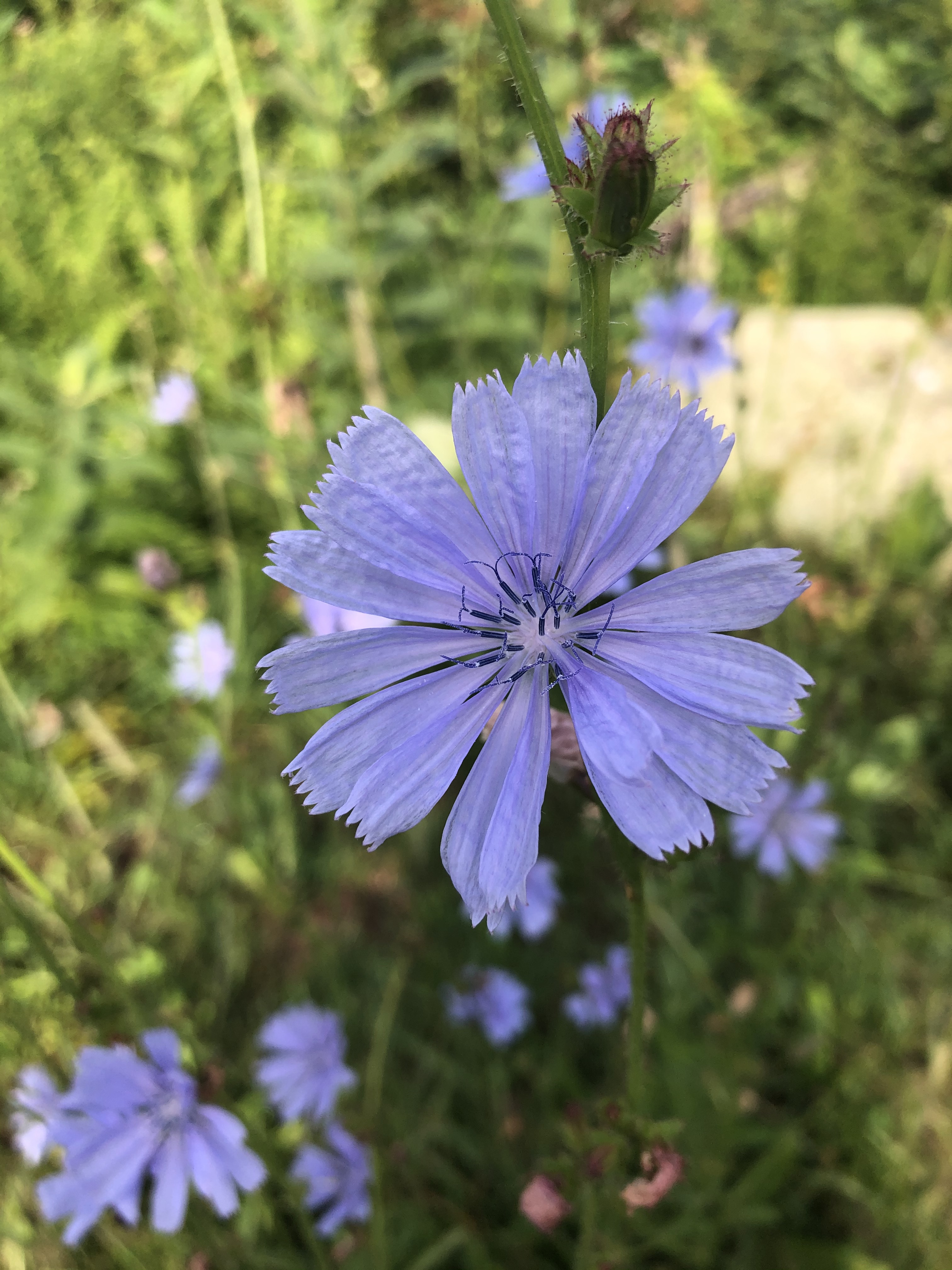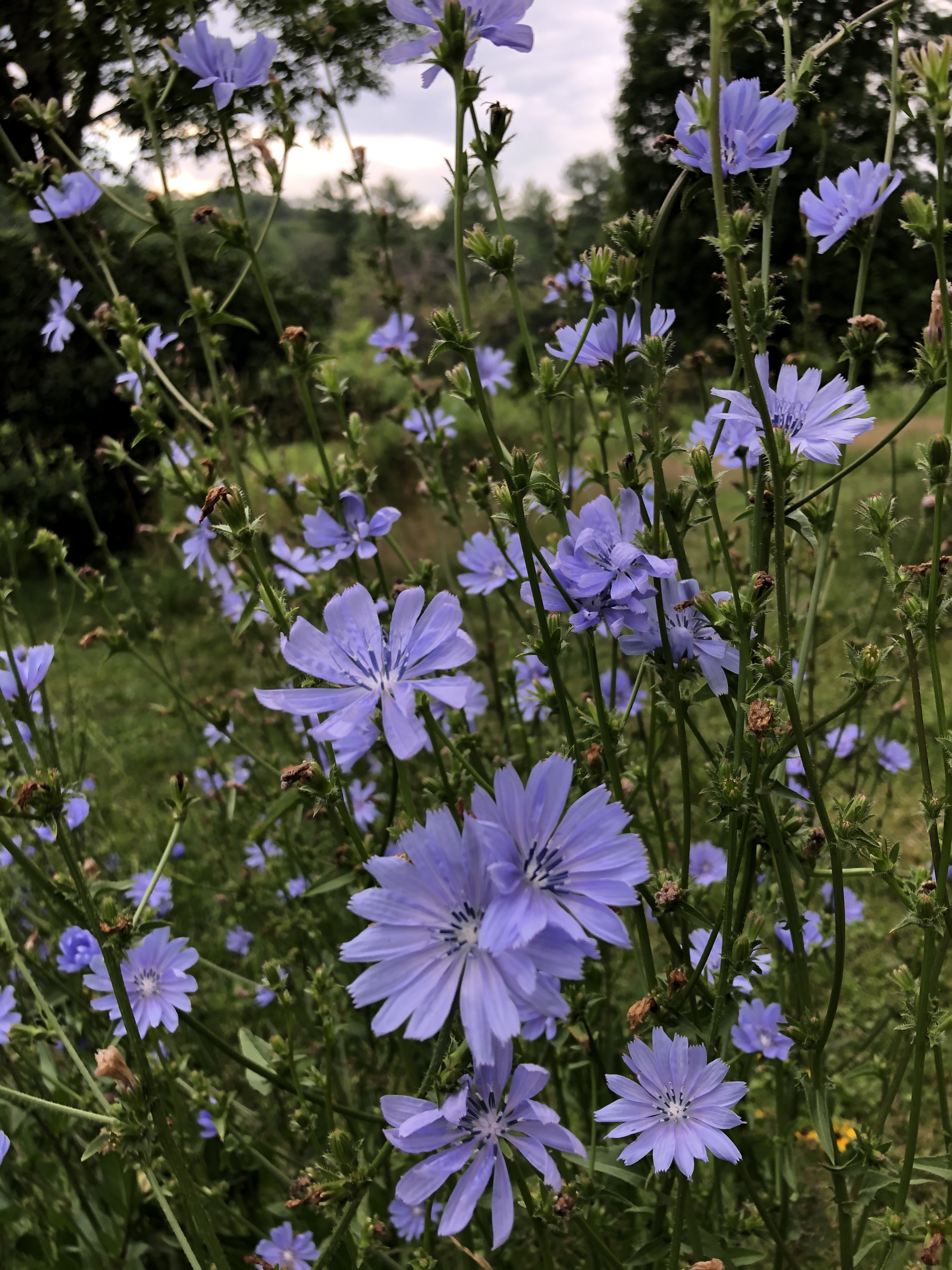 Today I am going to share a bit about Chicory. Cichorium intybus in Asteraceae is a “somewhat woody” herbaceous perennial who heralds from Europe and was brought over to North America as an edible, mainly for kins roots and leaves. You may know that the root is edible and used as a Coffee substitute. Note: don’t drink Chicory as a substitute for another beverage you crave; you will be disappointed. Instead drink Chicory root for itself. Like Coffee, Chicory is a bitter and you may develop a taste for ki. In addition to the root did you know that the flowers are also edible? You can eat them raw. Flowers are bright blue growing individually up spindly stiff stems. When the flowers close up in the evening, the plant can look somewhat on the edge between life and death. And then suddenly, the next morning, the flowers open and the plant looks vibrant again. The petals are reminiscent of miniature “sporks” having little teeth at the ends. And in the center the stamen and style look like a circle of long antennaed beings having a conversation.