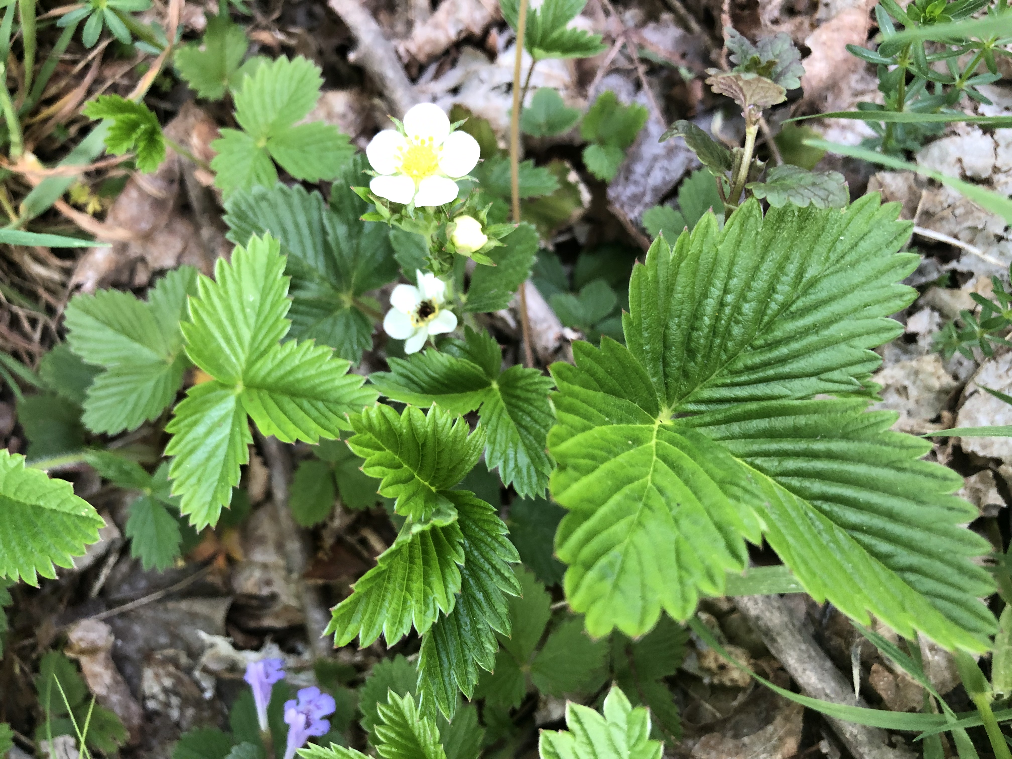 As you continue your walk, you find yourself on the edge of a field. This next three-leaflet plant you come across has deeply veined, wavy, toothed green leaflets that are fuzzy on the underside. The leaflet structure appears compact and all the petioles of the leaflets are of equal length. Honing in on the stem, you notice it is fuzzy, not wiry. You also observe this plant has a hairy, but not wiry, runner, leading to a developing plant – this is primarily how Wild Strawberry propagates, as the actual yellow seeds on the outside of the red berry are not strong germinators. And because this is May you also spy a white five-petalled flower with a yellow center. Take note of the site and come back in mid-June to see if there are little red berries that look like miniature versions of the strawberries you buy in the store. Native Wild Strawberry (Fragaria virginiana) fruit smells and tastes like what they are – strawberries. But then there is the introduced Mock Strawberry (Potentilla indica) heralding from southeastern Asia. Note, their flowers are yellow. Mock Strawberry berries are also red and are also edible but apparently are rather bland. Wild Strawberry berries, dangle whereas Mock Strawberry berries are erect off the stem. Both floras are in Rosaceae – the Rose family. Wild Strawberries are full of antioxidants and contain vitamins C, B and E. And their leaves are edible too. You can eat raw or as a tea to treat digestive complaints and diarrhea.