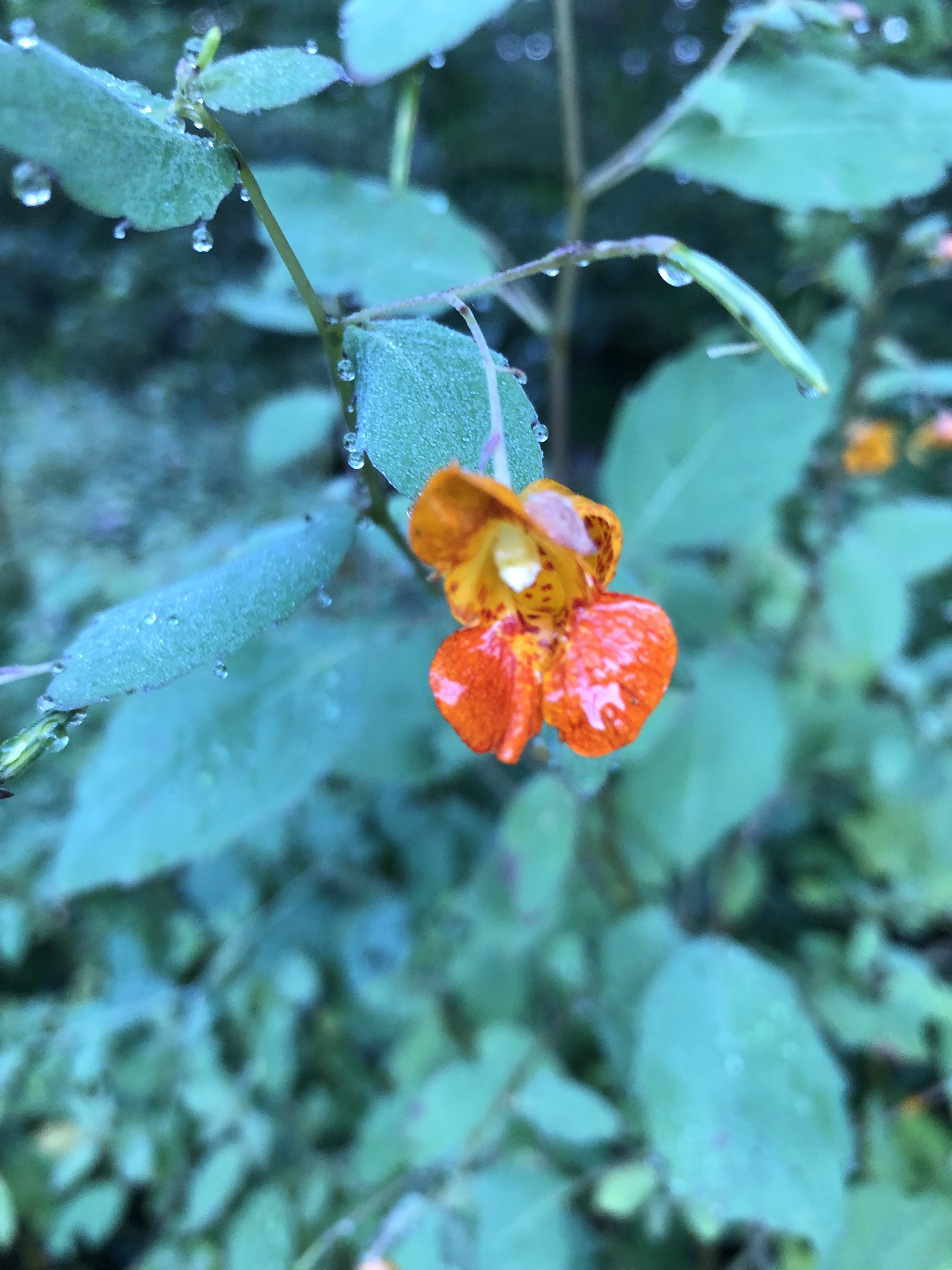 As spring progresses, in later April and early May, Jewelweed will emerge from the wet ground that they love. Jewelweed, aka Orange Jewelweed, Spotted Jewelweed, Spotted Touch-Me-Not, and Impatiens capensis, is an abundant native annual who grows in shade to partial shade. When they are babies, they can appear almost carpet-like in moist woods. As they grow, you may start noticing their shimmery green, widely-soft-toothed, alternate, elliptic leaves where raindrops and dewdrops bead. This is one reason they are called Jewelweed. They other is that inside their “touch-me-not” seed casings, are tiny robin-egg blue seeds that look very jewel-like. Depending on the variety, flowers can be orange or yellow with reddish-brown spots. The fused petals form a hood at the top and a spur in the back. They do not have a fragrance.