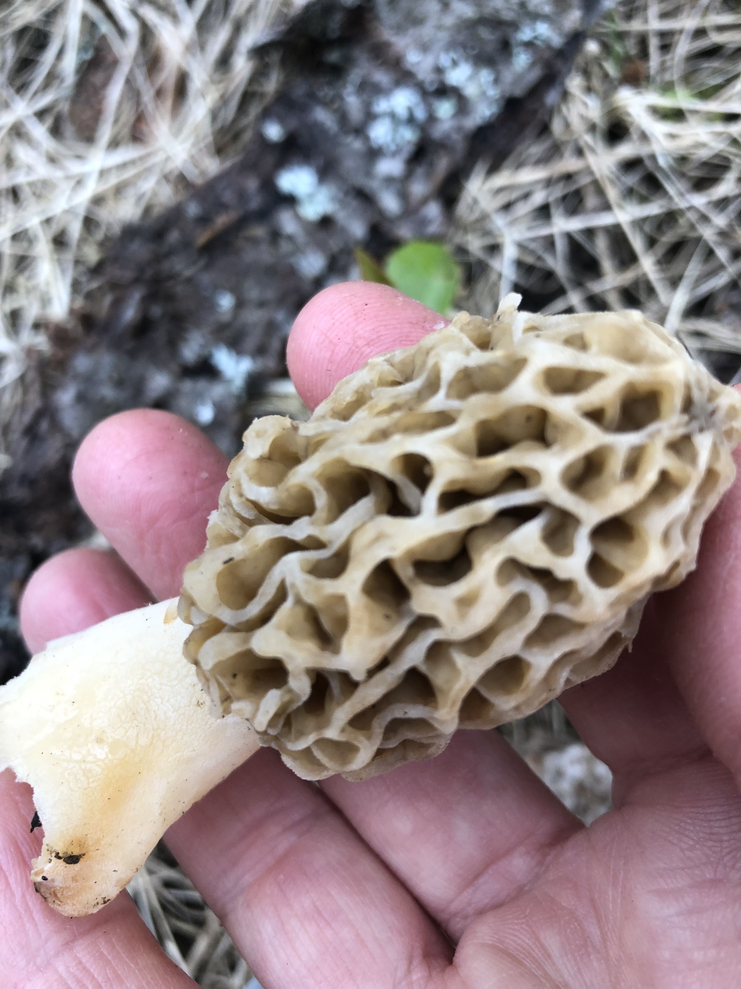 Morels’ caps appear brainy, wrinkly, and honeycomb like. Their color can be cream, yellow, or brown. Their stipes (stems) are stout and cream colored. The cap attaches directly to the stipe. They tend to grow up from the duff singularly and usually when you find one, you will find many more decorating the ground. To be sure they are a true Morel, and therefore edible, you must cut them in half lengthwise to be sure they are hollow throughout. from cap to the bottom of the stipe.