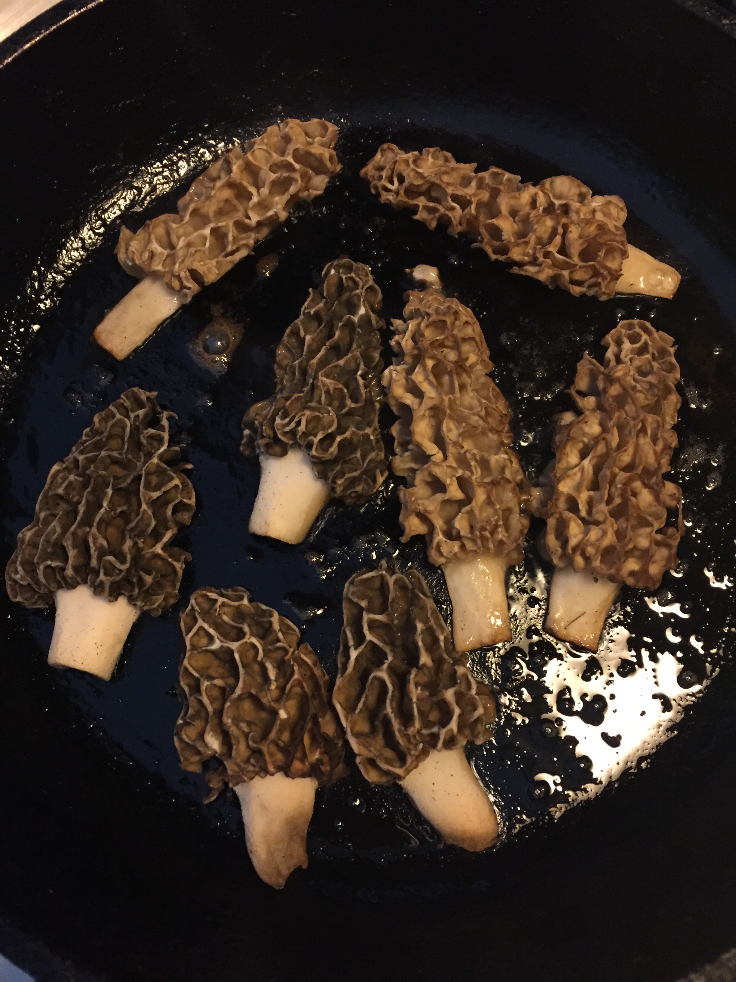 As mushrooms are the fruiting bodies of fungi, you will not kill the fungi by harvesting the mushroom. Whether you cut or gently pull up the mushroom, you are not damaging the fungus. But please remember not to pick them all. Leave some to spread their spores. Some for wildlife. Some for other foragers. Inspect the ones you’ve gathered for creepy-crawlies. If the cap is riddled with them, I would recommend passing on that individual and let the bugs have their way and that way more spores are left in Nature to spread more morels. After you have collected them and have returned home, rinse the mushrooms and then cut all in half lengthwise to be sure all are hollow – which also makes for easier sautéing. Sauté and eat. Their flavor profile is earthy, nutty, meaty. Yum!